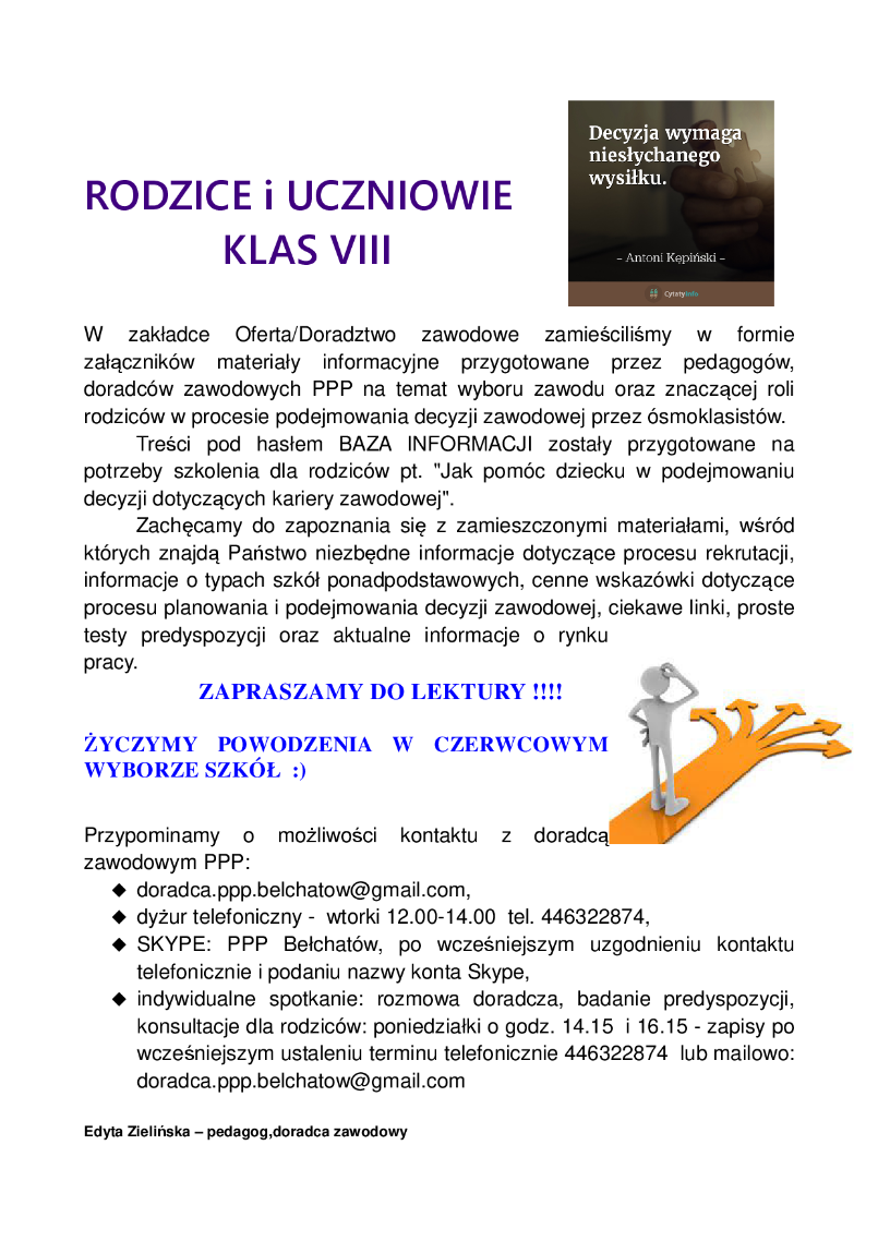 Doradcy zawodowi Poradni udzielali zainteresowanej młodzieży informacji o możliwości skorzystania z indywidualnych konsultacji, diagnoz predyspozycji zawodowych oraz oferowali ciekawe materiały dotyczące terminów naboru do szkół, warunków punktacji, czynników istotnych przy podejmowaniu decyzji edukacyjno – zawodowej.