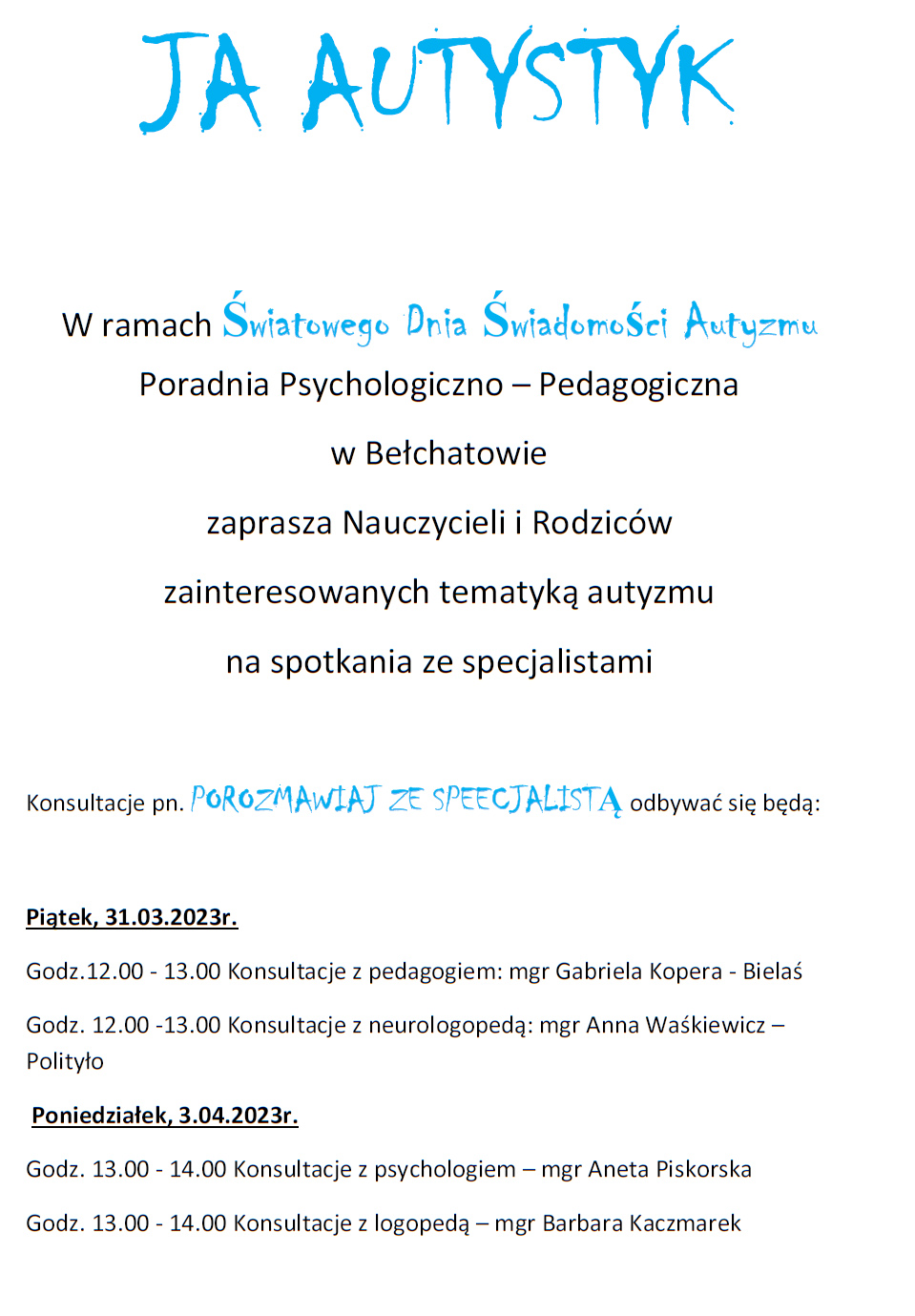 - rodziców i nauczycieli na indywidulane konsultacje - „Spotkanie ze specjalistą”