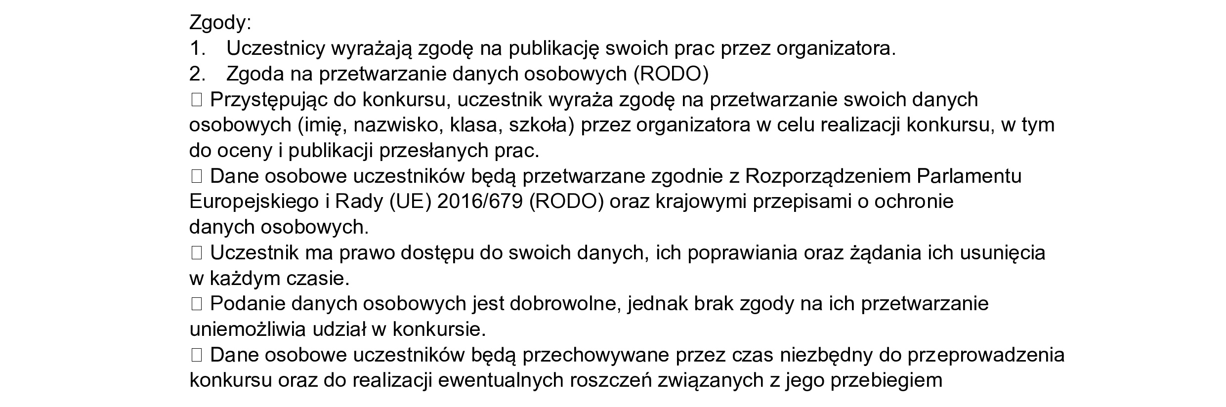 - pisemną zgodę rodzica lub opiekuna na udział dziecka w konkursie;