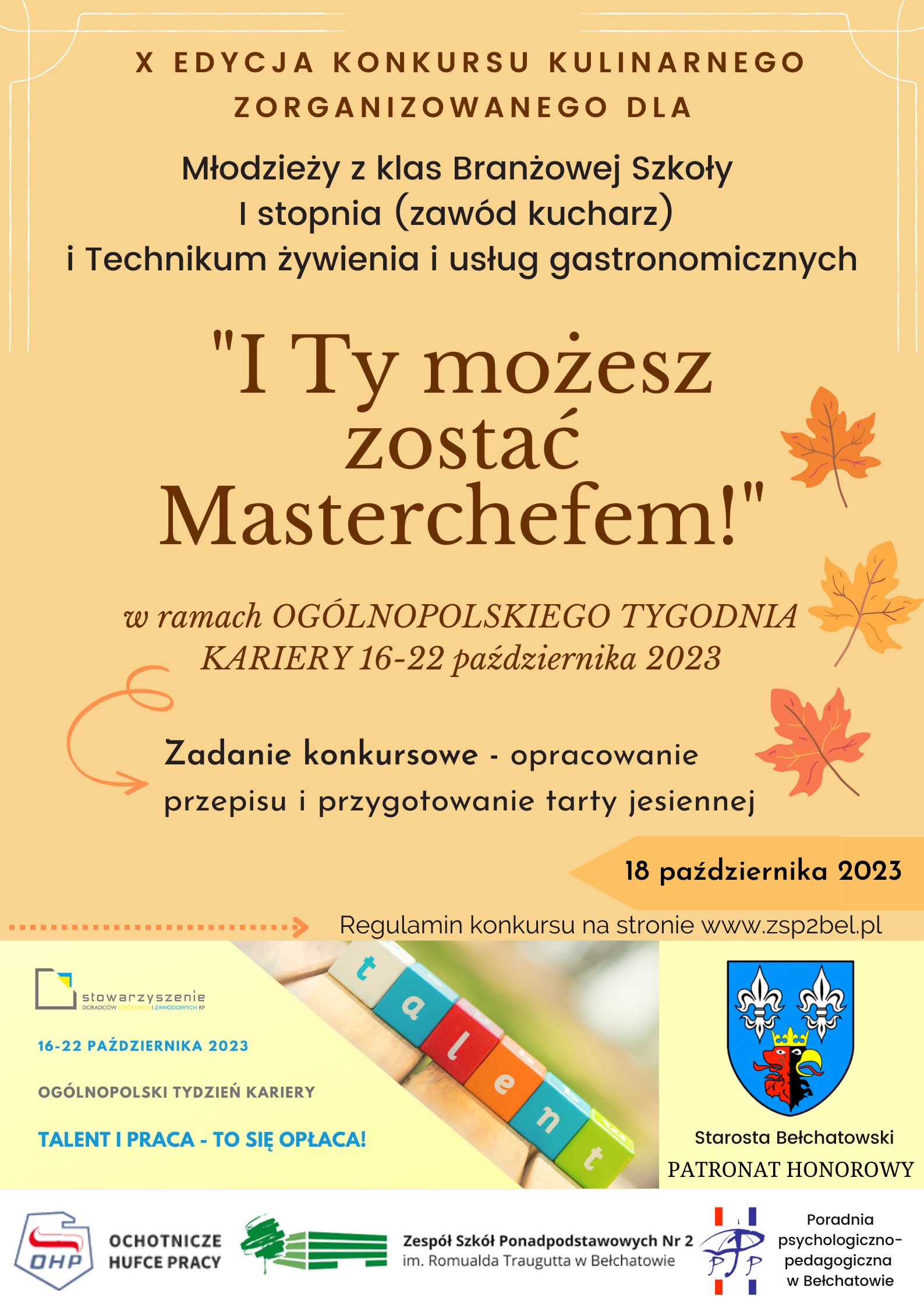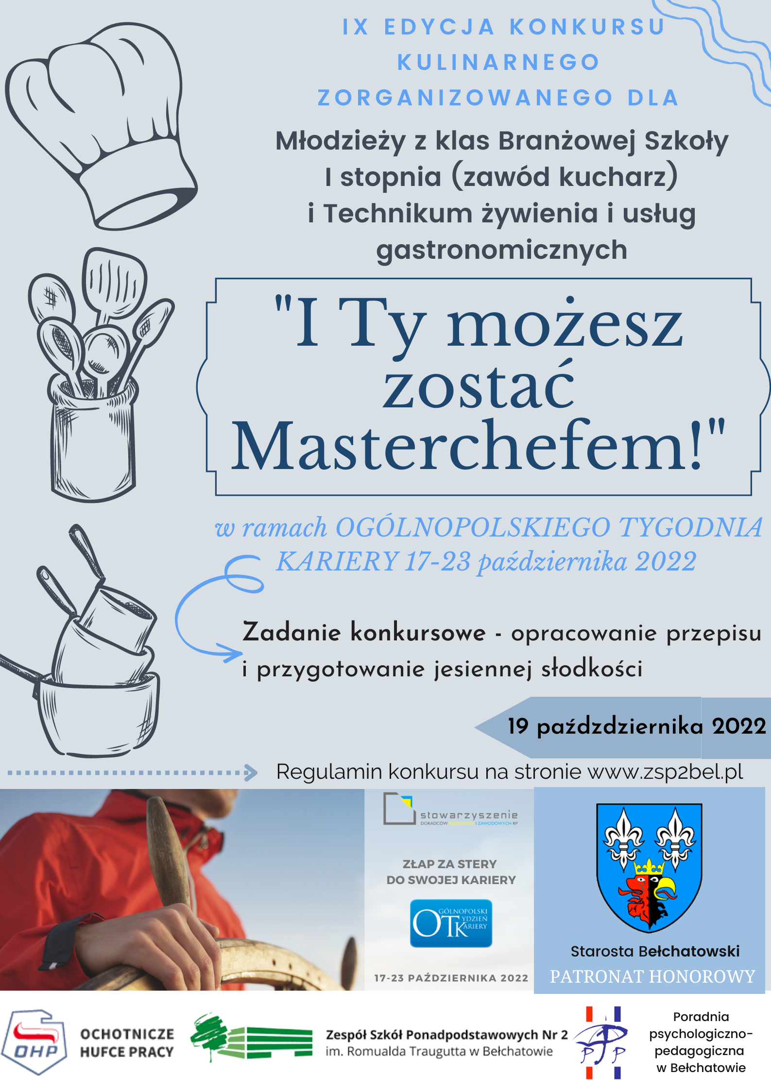 W dniu 19 października 2022r. w Zespole Szkół Ponadpodstawowych nr 2 w Bełchatowie odbył się już po raz dziewiąty konkurs kulinarny „I Ty możesz zostać Masterchefem!” w ramach Ogólnopolskiego Tygodnia Kariery 17 – 23 październik 2022r.