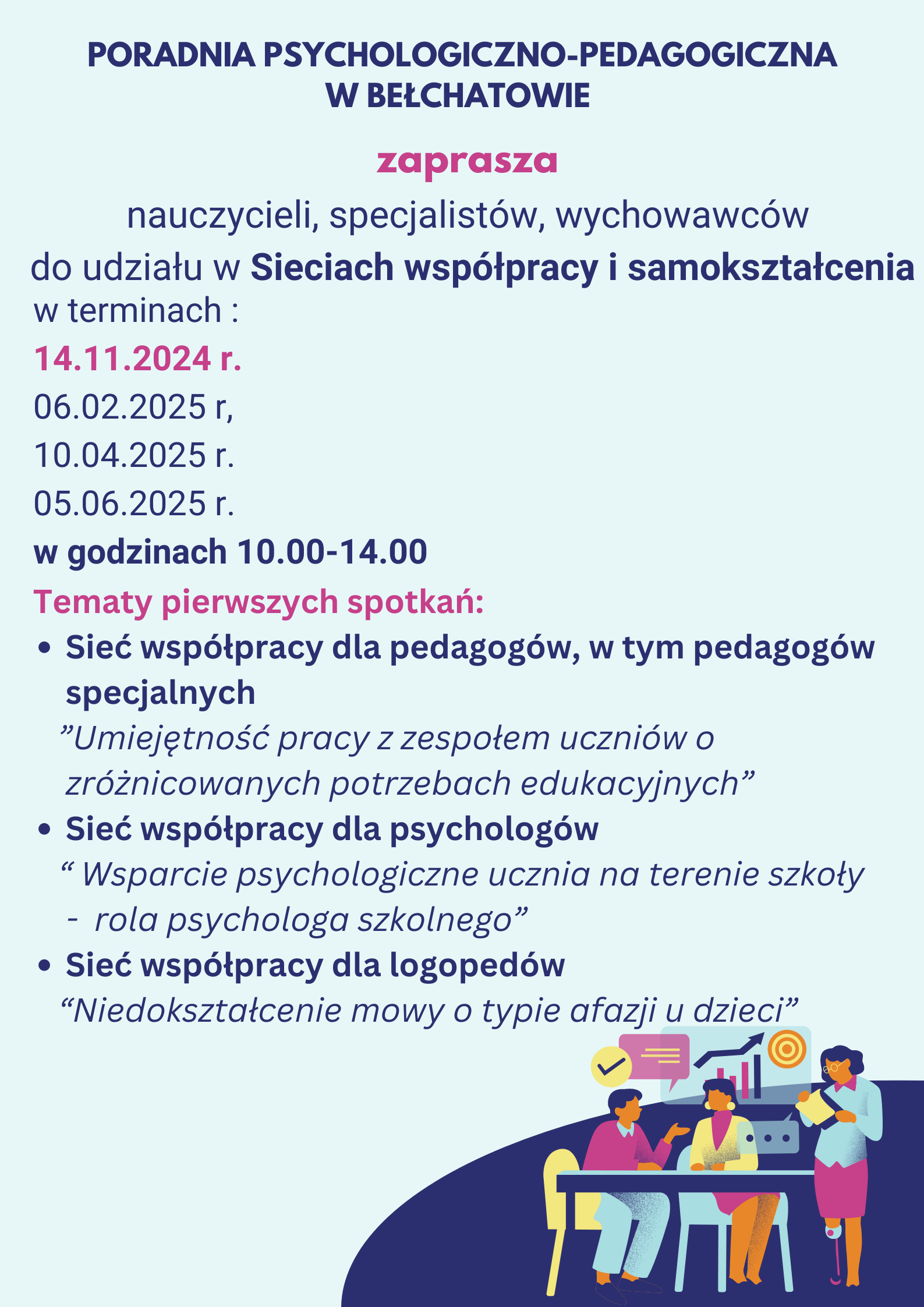 W dniu 5 czerwca 2025 r. w godz. 10:00 – 14:00 w Poradni Psychologiczno-Pedagogicznej w Bełchatowie odbyło się spotkanie nauczycieli w ramach Sieci Współpracy Logopedów.