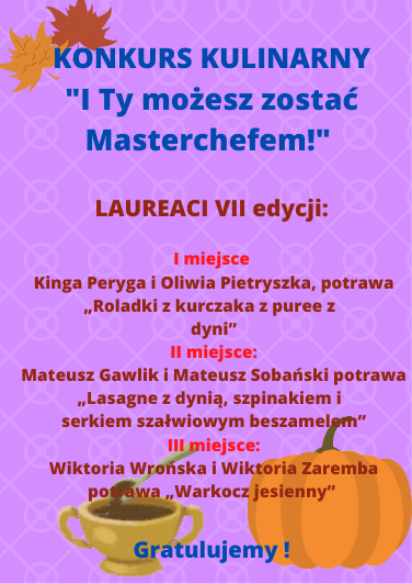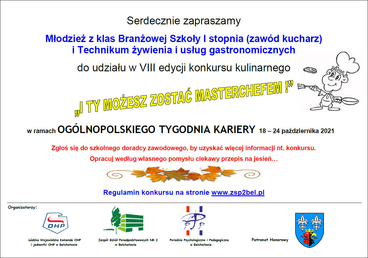 W dniu 21 października 2021r. odbył się już po raz VIII konkurs kulinarny „I Ty możesz zostać Masterchefem!”. Konkurs realizowano w ramach Ogólnopolskiego Tygodnia Kariery 18 – 22 października 2021.