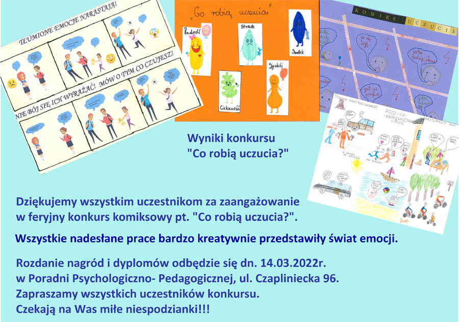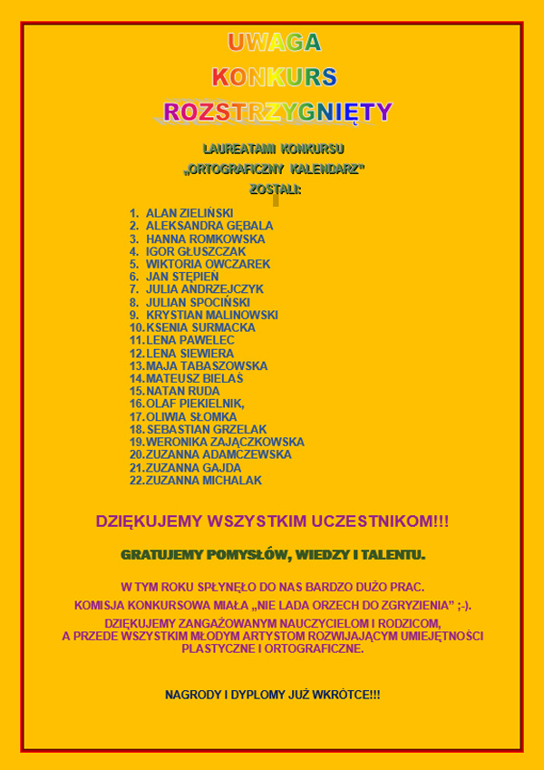 "Wszystkich uczestników konkursu pt. "Kalendarz ortograficzny" zapraszamy po odbiór nagród i dyplomów do Sekretariatu Poradni."
