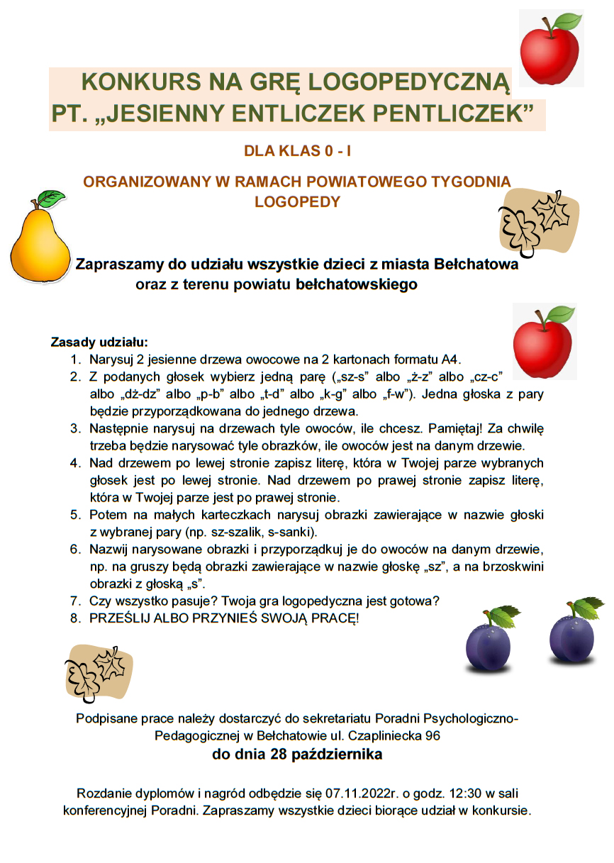 W dniu 07.11.2022r. w Poradni Psychologiczno-Pedagogicznej w Bełchatowie odbyło się podsumowanie konkursu logopedycznego pt. „Jesienny entliczek pentliczek”, zorganizowanego w ramach Powiatowego Tygodnia Logopedy. Do konkursu przystąpiło 25 osób z terenu powiatu bełchatowskiego. Każdy wykonał prace według wcześniej określonych zasad. Komisja konkursowa wyłoniła zwycięzców, przyznała nagrody i wyróżnienia. Wszystkim uczestnikom dziękujemy i zapraszamy do udziału za rok.